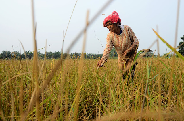 Bersama anak perempuannya, Erni (34), ibu empat anak itu memanen padi yang jumlahnya tak seberapa. Tangannya bergerak memetik padi dengan menggunakan ani-ani. Di bawah terik matahari, sesekali Rahana menyeka keringat yang mengalir di kening dan lehernya. Sejak pukul tujuh pagi, dua perempuan itu bekerja. Hasilnya, mereka mendapat sekitar tiga puluh genggam padi.